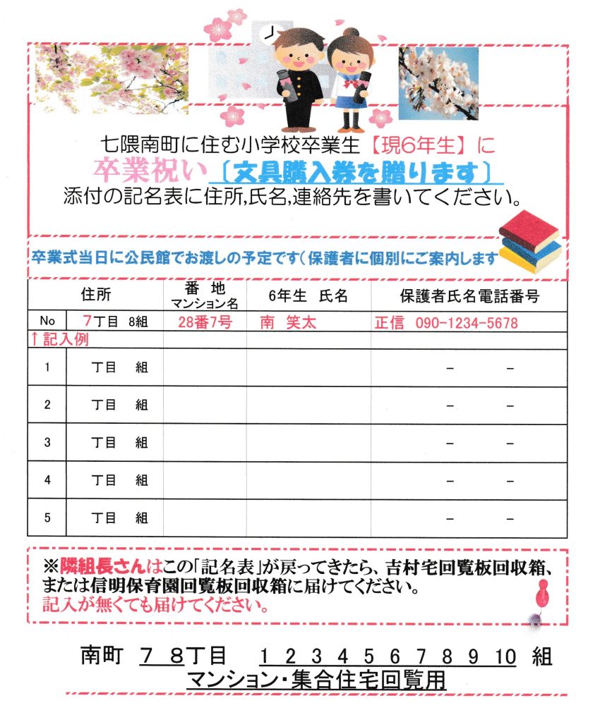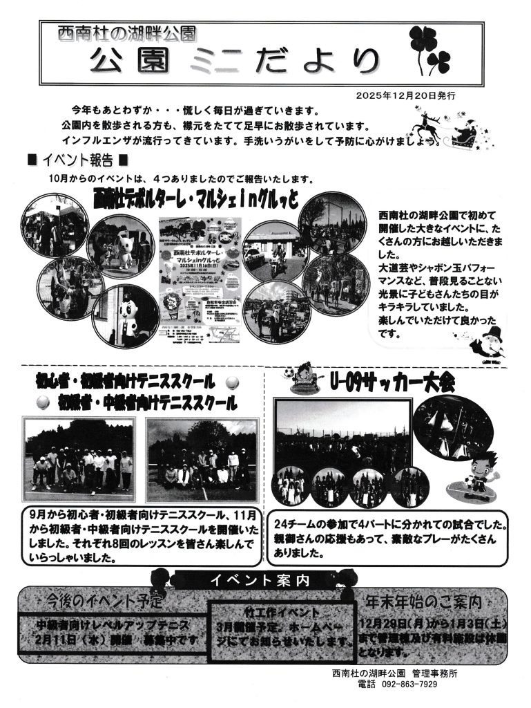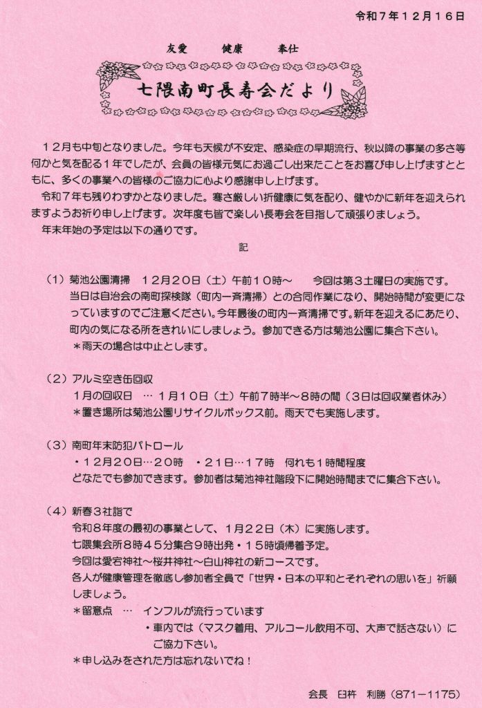 12月の回覧板です。12/14(日)は信明保育園で南町もちつき大会、5日は夜パト、20日・21日は年末パトロール、20日10時から町内清掃「探検隊」です。