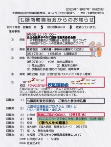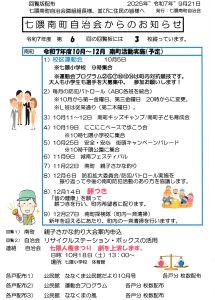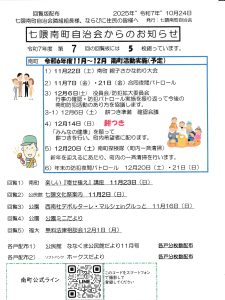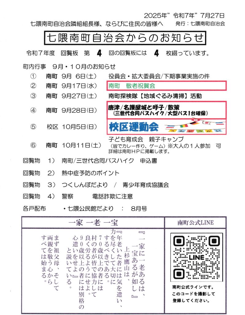 8月の回覧板です。厳しい暑さです。気を付けて過ごしてください。 2025 7/30 お知らせ 回覧板 2025年7月30日 お知らせ 回覧板 関連記事 NEW!12月の回覧板です。12/14(日)は信明保育園で南町もちつき大会、5日は夜パト、20日・21日は年末パトロール、20日10時から町内清掃「探検隊」です。 2025年11月26日 11月の回覧板です。11月2日は公民館で文化祭があります。ほかにも行事がたくさんあります。 2025年10月24日 10月の回覧板です。5日は運動会、11日12日は南町キッズキャンプ、18日は人権まつりなど、楽しい催しがあります。 2025年9月27日 9月の回覧板です。まだまだ暑い日々です。9/17は南町敬老会、9/27は南町探検隊(一斉清掃)、10/5は校区運動会です。 2025年8月27日 7月の回覧板です。7/19は親子釣り大会です。希望者は申し込んでください! 2025年6月29日 6月の回覧板です。6/7は三世代交流バーベキュー大会、6/8は防災避難訓練、6/28は一斉清掃です。 2025年5月28日 5月の回覧板です。4/26七隈南町自治会定期総会がありました。6/7バーベキュー大会(要申込)、6/8防災研修(申込不要)にご参加ください。 2025年4月27日 4月の回覧板です。ご入学おめでとうございます。南町自治会総会は4/26(土)10:30からです。 2025年3月27日